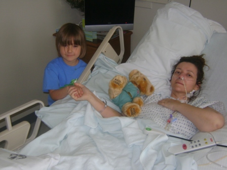 Deb after the first surgery for stomach problems. It was supposed to be a one-day stay...but turned into 7 because of complications. Scott left for Turkey the the day before she was released.